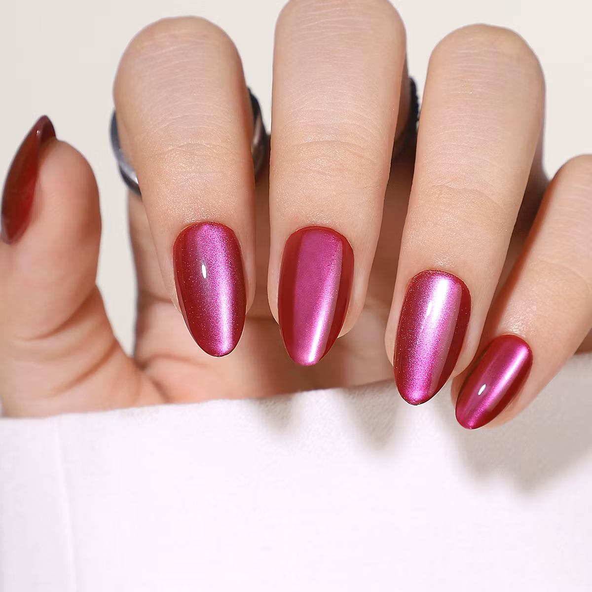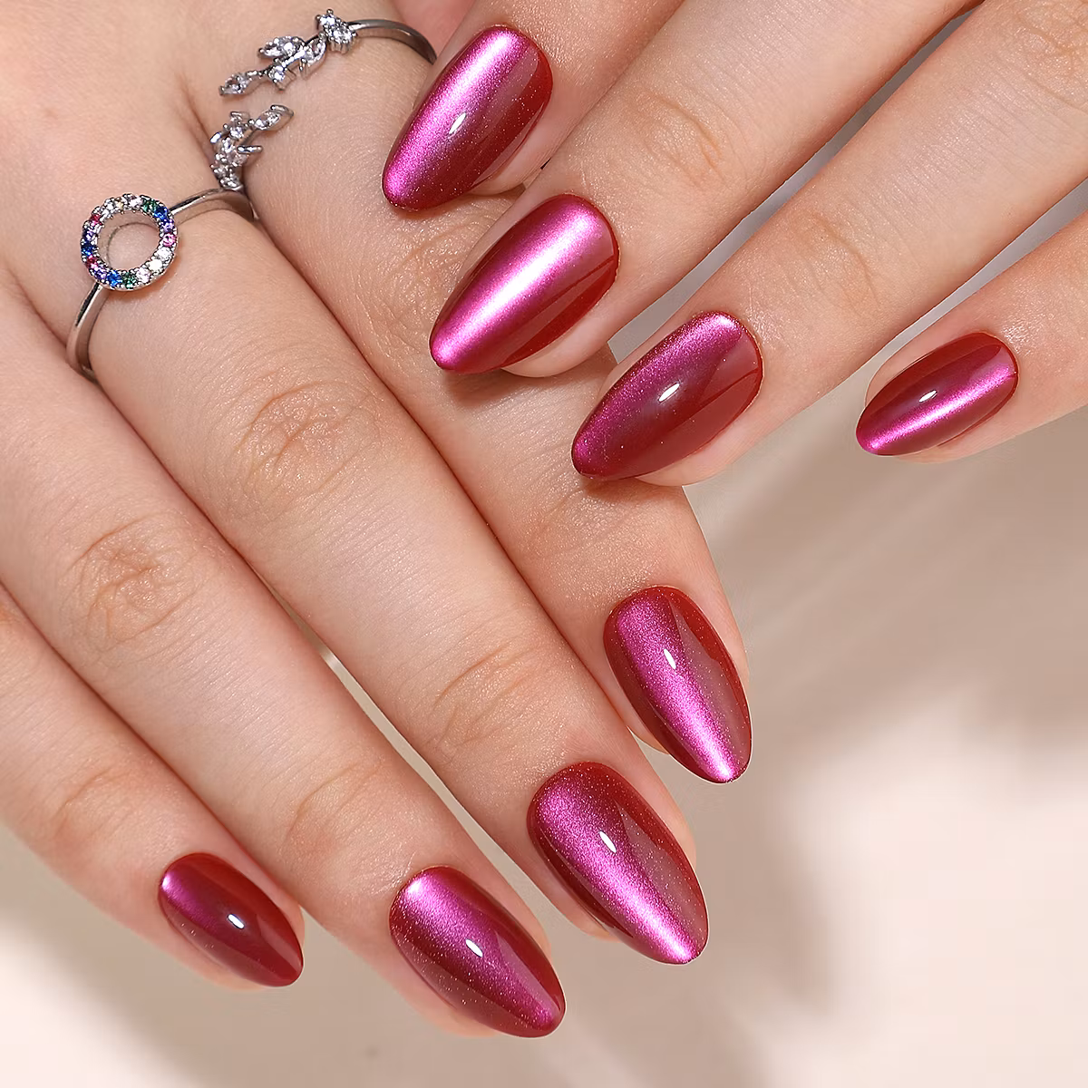 Upplev en sofistikerad och glamorös look med våra Almond press-on naglar i en förförisk rödrosa nyans med skimrande finish. Denna färg är perfekt för dig som vill ha en modern och iögonfallande stil som fungerar lika bra till vardags som på fest.
