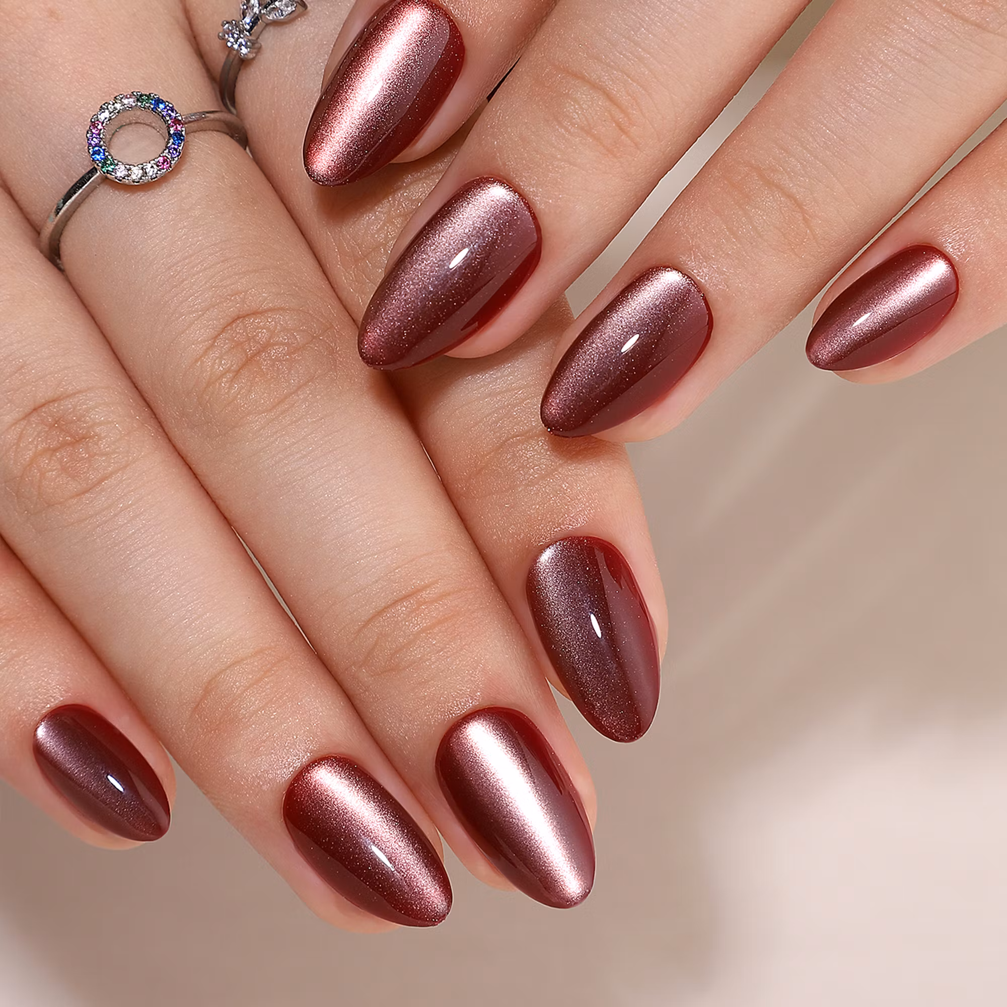 Shimmering Rose Almond har en djup rosenröd färg med en skimrande, metallisk finish som ger en lyxig och elegant känsla. Denna design på Press-on naglarna passar perfekt för både festliga tillfällen och när du vill känna dig extra uppklädd till vardags. Den sofistikerade nyansen är idealisk för höst och vinter, men kan även användas året runt för att skapa en glamorös look som sticker ut.
